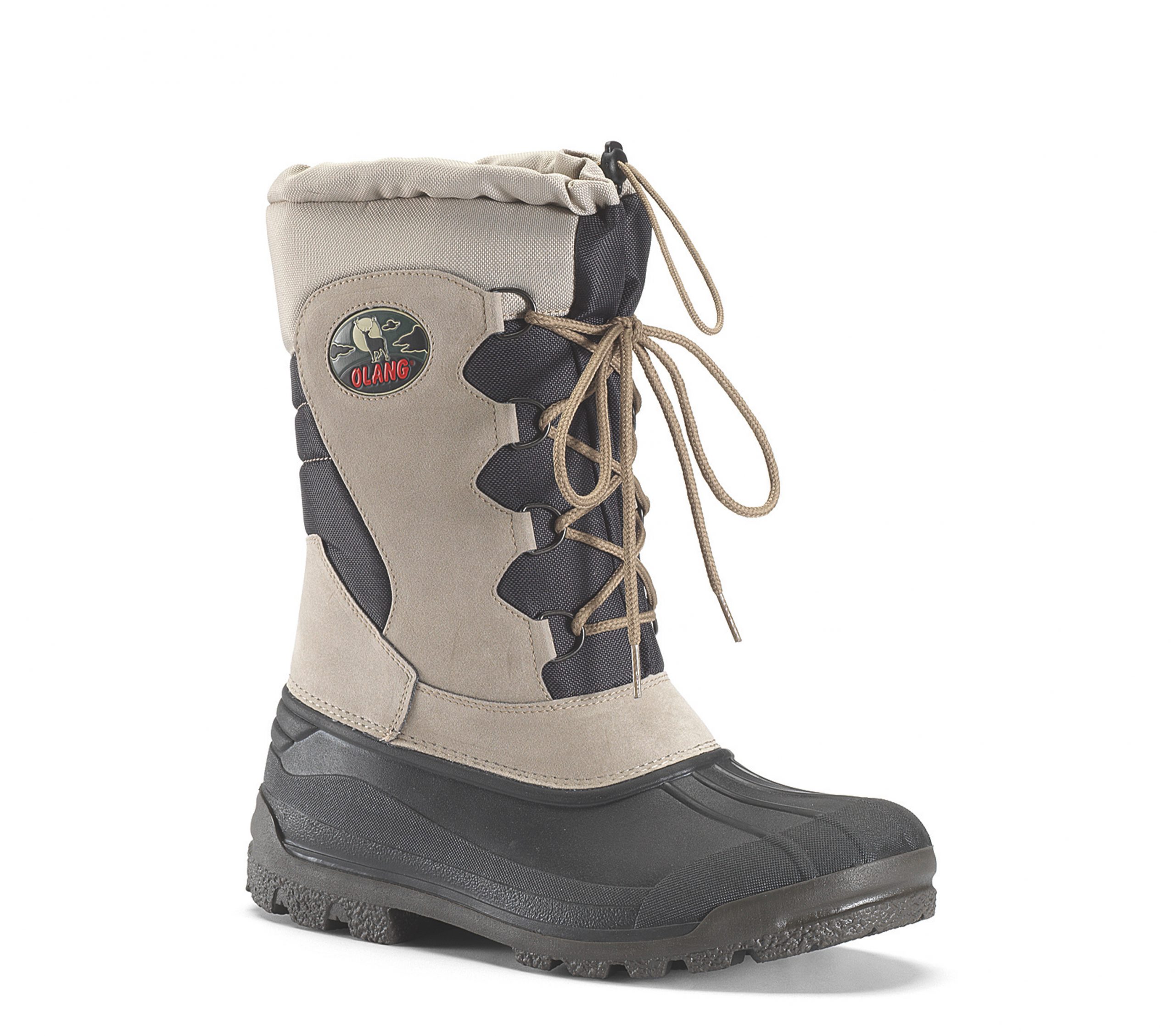 De Olang Canadian is een snowboot met een hoge schacht. De laars is vervaardigd van suède leer. De zool biedt grip en maakt de voet van de laars waterdicht. De laars is gevoerd met een polyester wollen voering. De Canadian heeft een vetersluiting en een tie-on koord aan de bovenzijde, zodat de laars goed om de kuit sluit.
